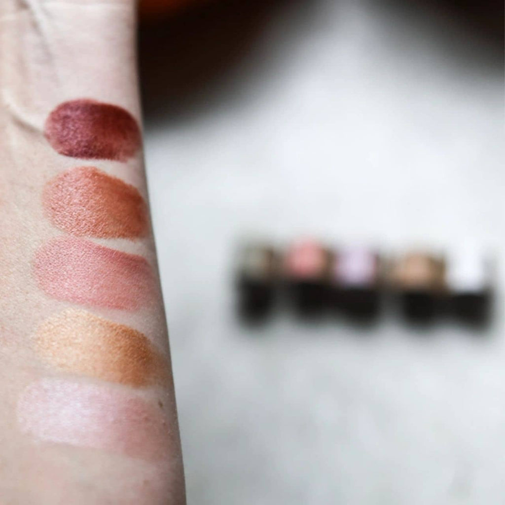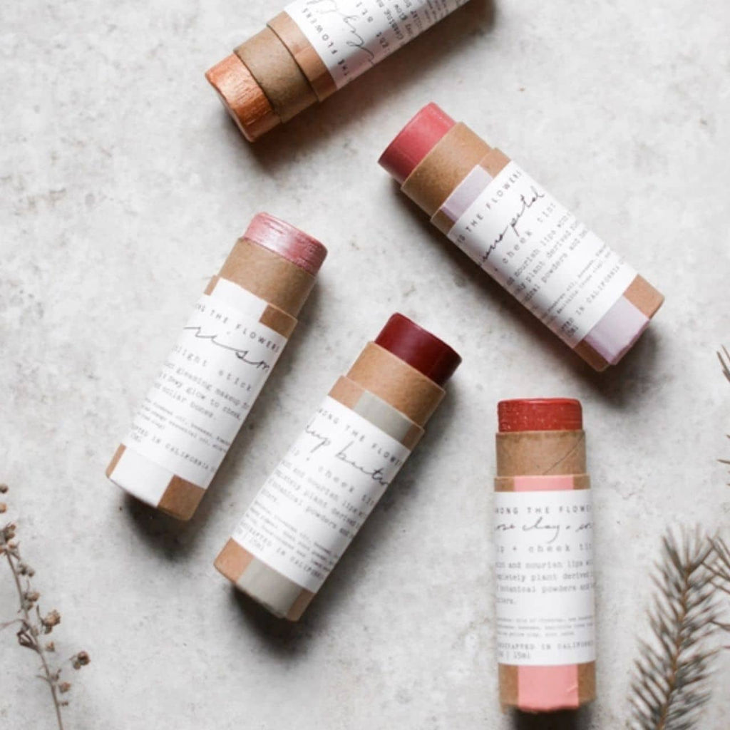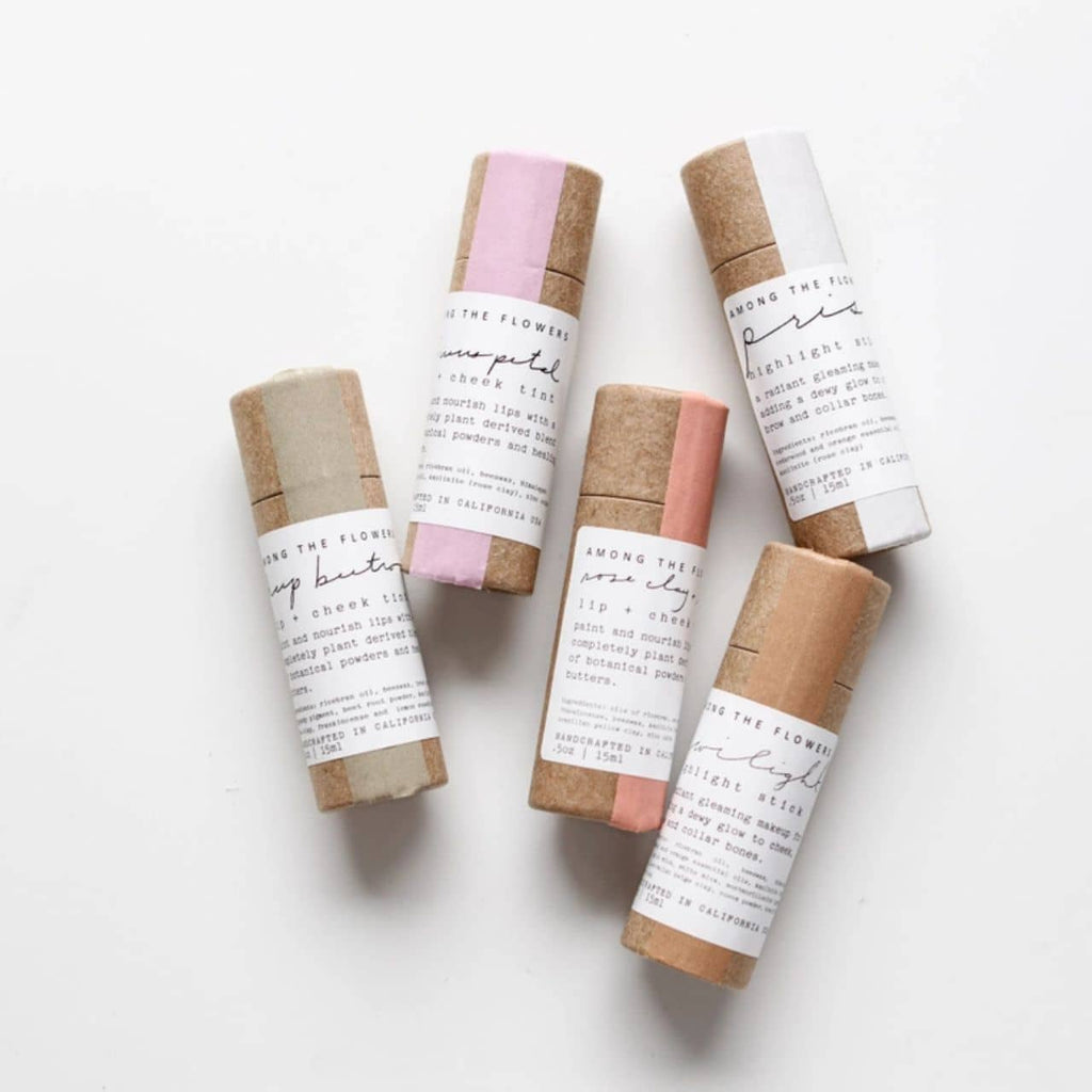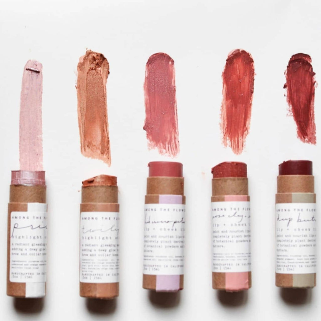 Included: 3 Lip + Cheek tints, Prism Highlight stick + Twilight Low Light stick. A perfect way to blend together the beautiful colors nature provides to create your own palette. All five makeup pigments come in a handmade wooden box, with a dried flower bouquet. ($22 each, $79 for the set).